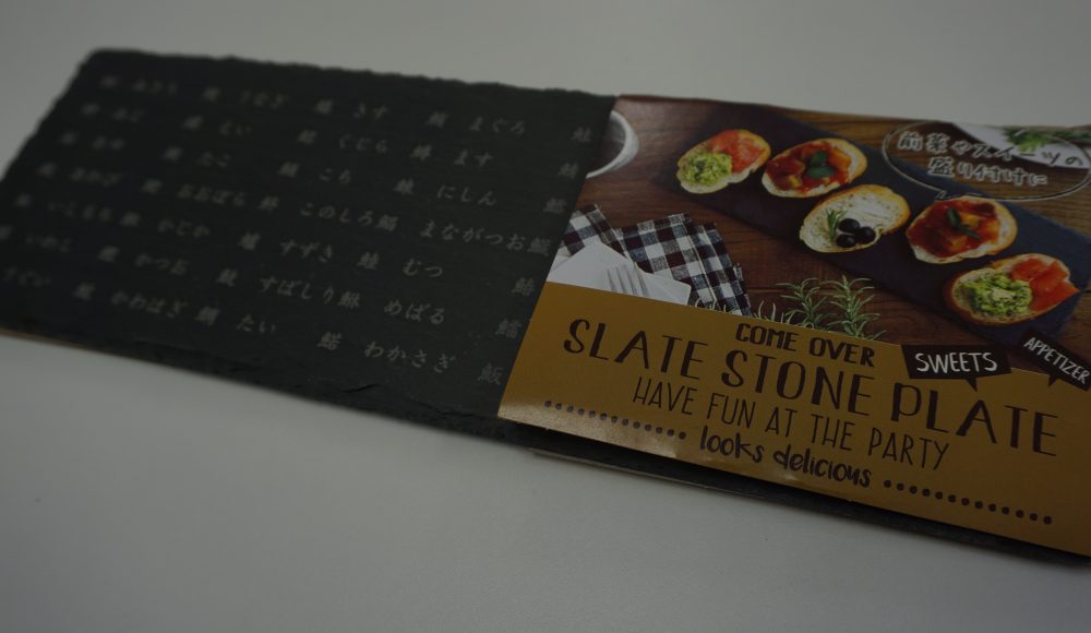 最近よくみるスレートストーン(粘板岩)もレーザーマーキングなら洗っても消えない印刷が可能です オリジナルのプレートを作成すれば、お店でも引き出物にもアピール大です。